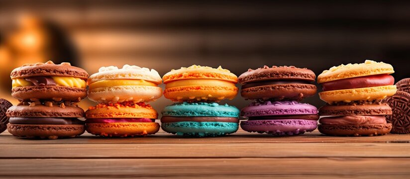 A variety of colorful sandwich cookies sits on a wooden table creating a visually appealing display with sufficient space available for text or additional images