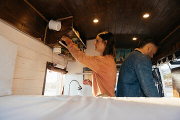 Diverse couple planting seedlings together in home kitchen for sustainable living