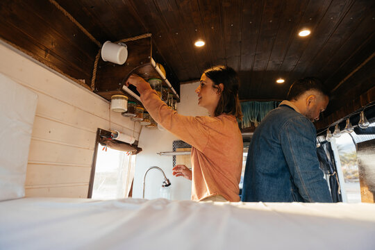 Couple building rocky fire pit at mountain campsite with yellow tent gathering firewood