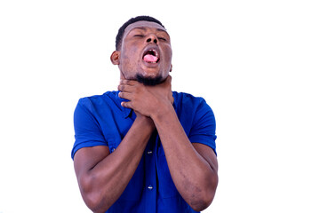 young businessman suffocating holding neck with his hands.