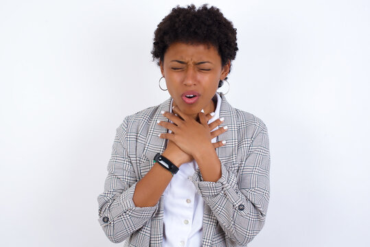 African American businesswoman with curly bushy hair wears  formal clothes over white background shouting suffocate because painful strangle. Health problem. Asphyxiate and suicide concept.