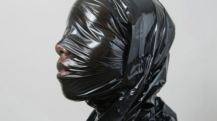 A woman with a plastic bag over her head, symbolizing suffocation or environmental issues