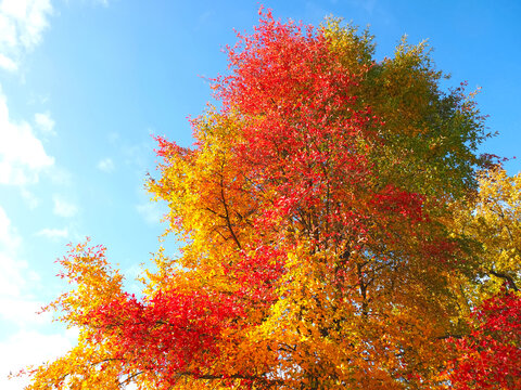 Colours of autumn fall - beautiful black Tupelo tree in front of blue sky