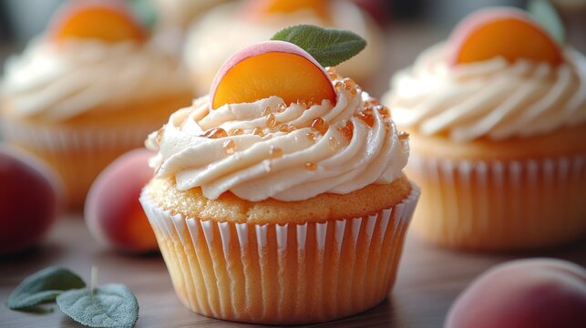 Cupcakes with frosting and peach slices are displayed on a wooden surface.