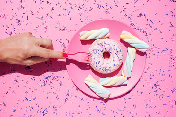 Hand of woman picking up doughnut from plate of sweets