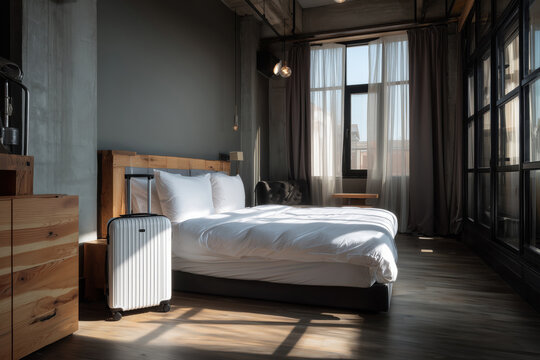 Modern hotel room featuring empty bed with linens and suitcase standing near bed, sunlight streaming through large window, showcasing contemporary hospitality service concept
