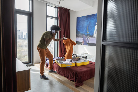 Young man packing suitcase on bed in modern minimalist bedroom preparing for trip
