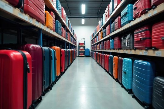 Bright suitcases stand in row at airport. Colorful baggage is ready for transportation. Passengers wait near departure area for their travel. Safe flight concept in terminal interior during journey.
