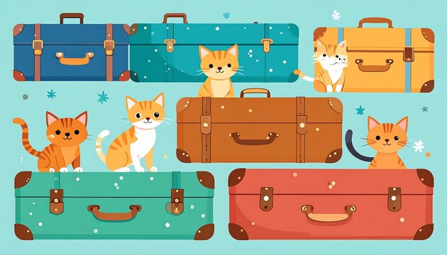 Adorable cartoon cats and matching suitcases ready for travel