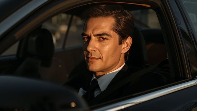 Suited executive gazing through driver window at golden hour - luxury car interior portrait