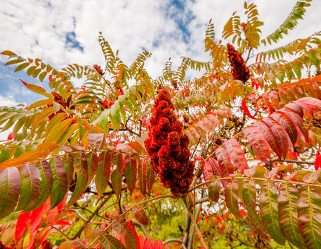 Beautiful blooming sumac tree. Deer-horned sumac, or Fluffy sumac, vinegar tree with red flowers on a rural road.