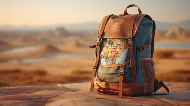 an old traveler's backpack with a world map painted on it, the backpack is standing on a rock and the desert in the background