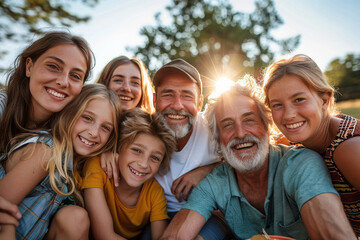 Faces of a multigenerational family lit up by summer sunshine at a joyful outdoor picnic