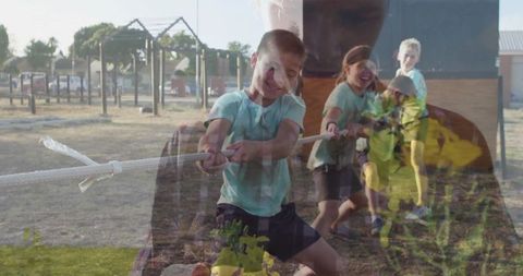 Joyful family engaging in outdoor tug-of-war competition