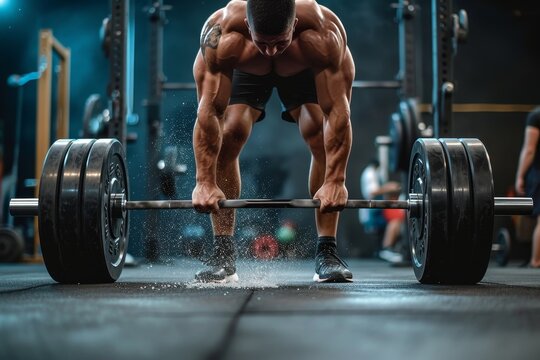 Athletic man preparing for deadlift in gym environment
