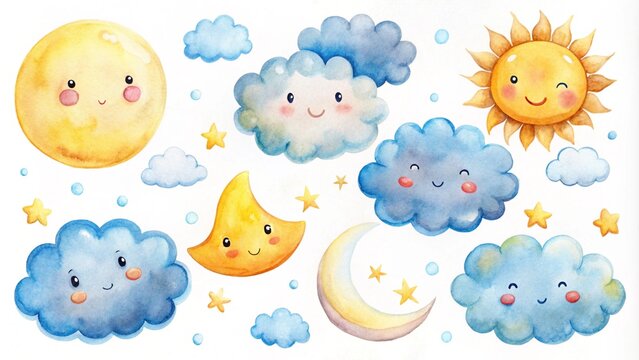 Set of cute watercolor clouds and suns with a smiling moon, and weather concept. Adorable watercolor artwork featuring a set of fluffy clouds and glowing suns, all with endearing smiles
