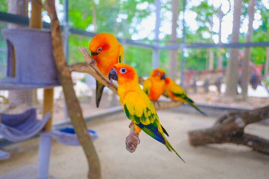 Pair of Sun conure or sun parakeet sitting on a branch at a pet zoo
