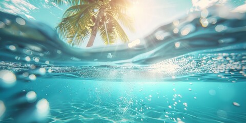 Underwater photo of the sea, with tropical palm trees, the sun's rays filtering through the surface of the water, clear blue tones, summer vibes.