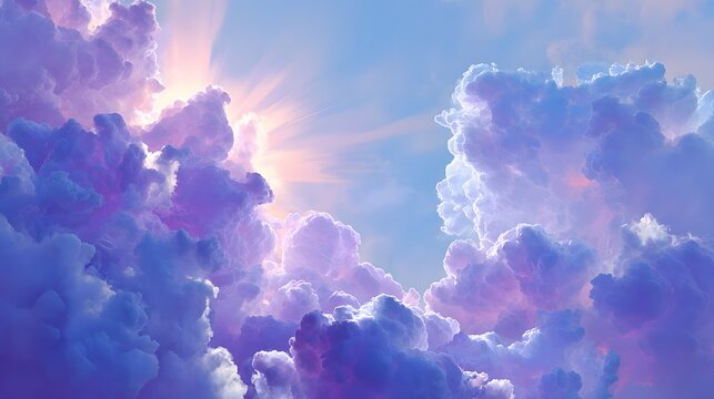 Sun ray streaming cumulus clouds with pastel sky