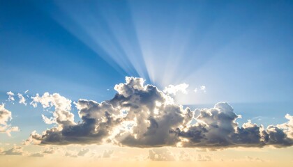 Captivating image of a cloudscape, sun rays piercing through the fluffy clouds, and blue skies.