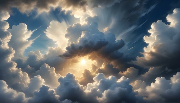 A stunning close up of clouds features powerful sun rays piercing through them. The dramatic clouds create a captivating backdrop against a beautiful blue sky adorned with the sun and clouds.