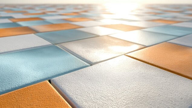 Close-up view of a patterned tile floor, in shades of orange, light blue, and white, with sunlight reflecting
