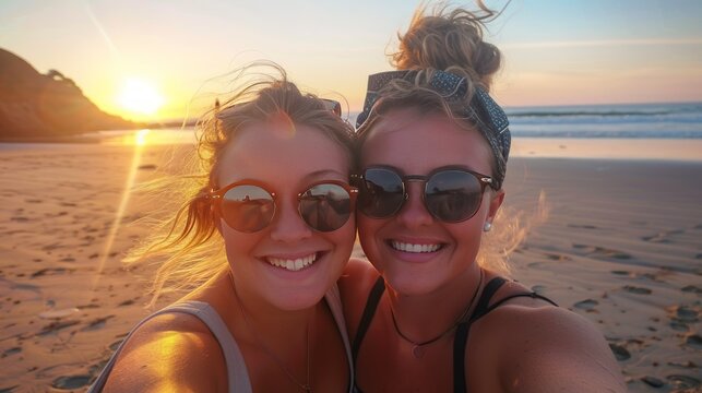 Smiling Woman Enjoying a Sunny Day at the Beach With Colorful Sunglasses On.