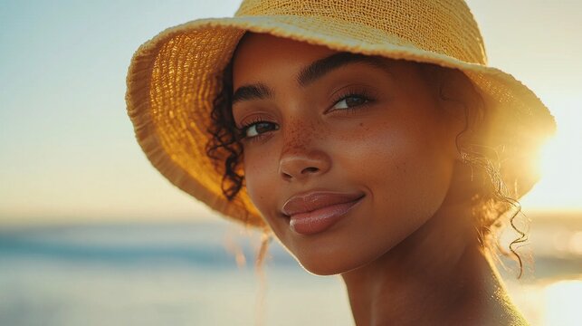 A woman enjoys a peaceful moment under the sun, wearing a wide-brimmed hat that highlights her radiant smile. The beach setting offers tranquil waves and a warm ambiance during golden hour