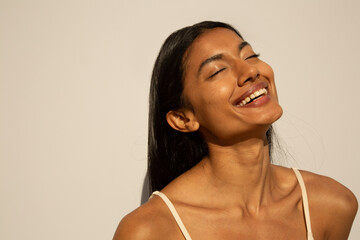 Mixed race woman sunbathing by pool on a sunny day smiling