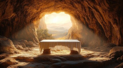 Sunlit rocky cave interior with a table covered in white cloth at its center overlooking a distant hazy mountain landscape filled with warm golden light
