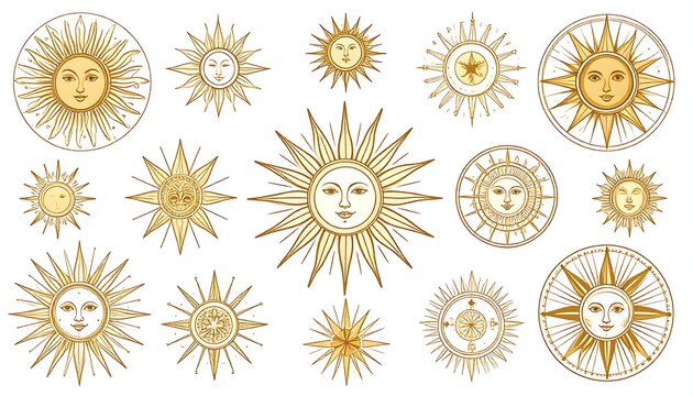 An array of varied stylized golden sun illustrations, each with a face, against a stark white background