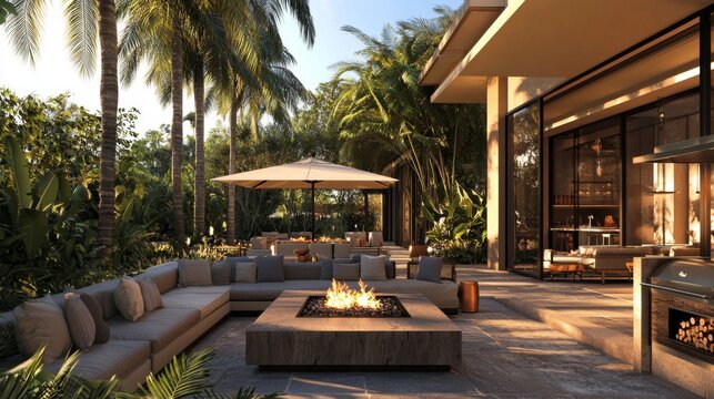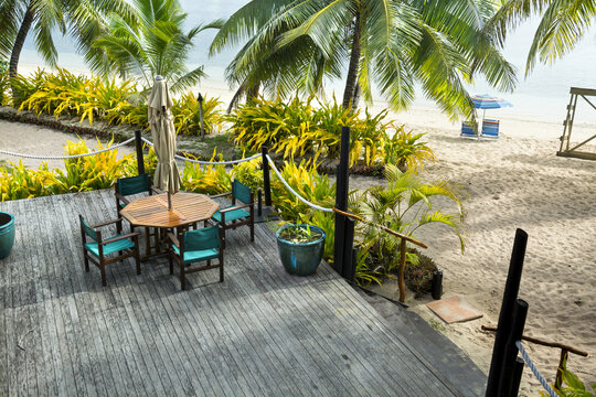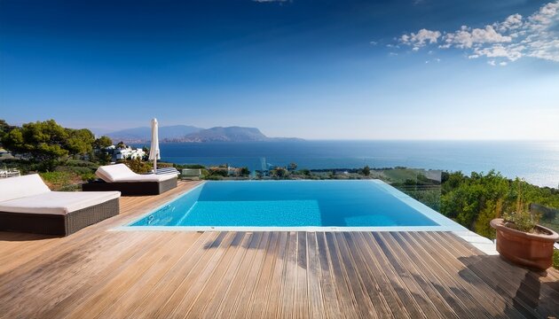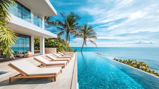 Sea view.Luxury modern white beach hotel with swimming pool. Sunbed on sundeck for vacation home or hotel