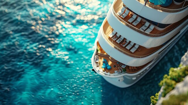 Luxury yacht with multiple decks and lounge chairs, viewed from above, anchored in clear blue water.