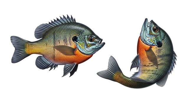 Two Bluegill Sunfish Swimming in Clear Water Isolated on White Background.