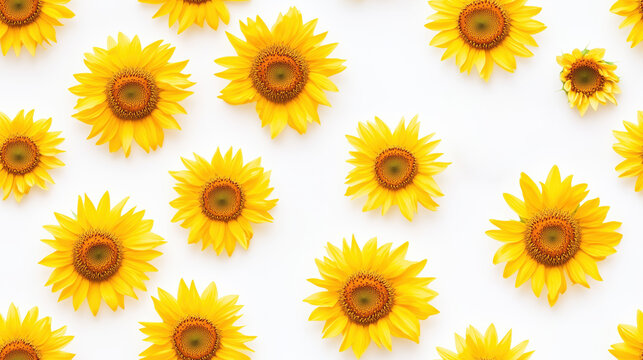 Bright seamless pattern with sunflowers evenly arranged on a white background. Perfect for textile design, wallpapers, and packaging