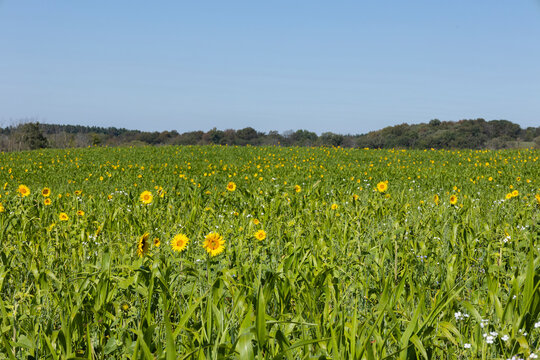 A field of cover crops with sunflowers on a sunny day.