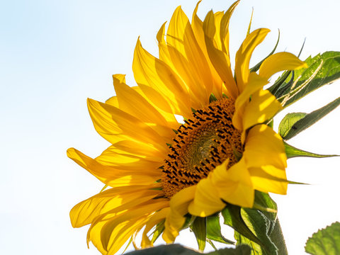Autumn sunburst sunflower blooming in soft summer light with warm golden petals