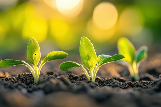Young sunflower seedlings are reaching for the sun in the fertile soil of a spring garden