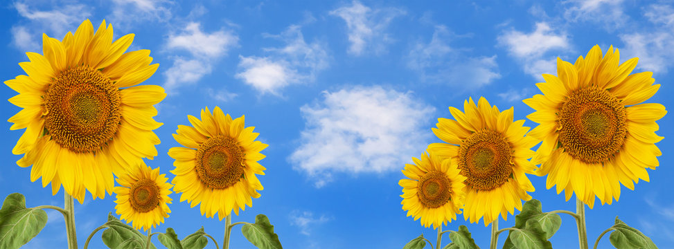 Beautiful sunflowers on blue background. View from above. Background with copy space.