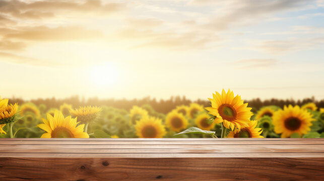 Sunflower on a wooden table with a sunflower field landscape and sunset mountains in the background