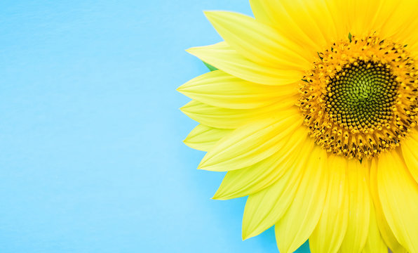 Sunflowers among the leaves on a sunny day with a blurred background. Flower head or pseudanthium, its ray flowers and the center of the head or disk flowers