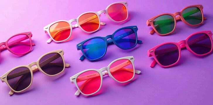 Collection of colorful modern sunglasses on purple background, sunlight, stylish