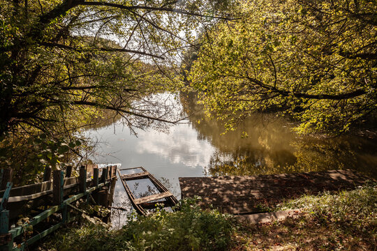 Panorama of a pond by the danube river in hungary with a wooden dock and a sunk old rowing boat in Duna Drava Nemzeti Park in Mohacs, Hungary. It's a Hungarian National Park by danube & drava rivers.