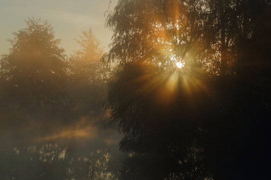 Magical sunlight filtering through forest trees in early morning