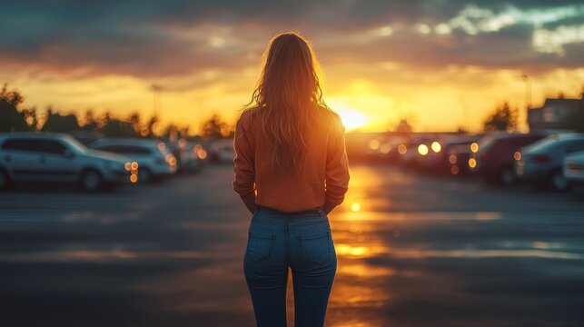 Woman standing in parking lot during a sunset with sun rays