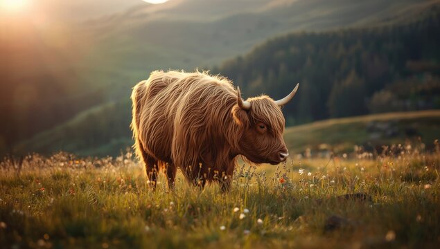 Close-up of a cow bathed in sunset glow, highlighting rural scenery and animal care practices