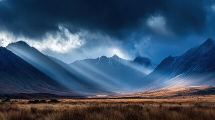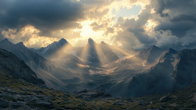 Majestic sunlight breaking through clouds over mountain range a dramatic landscape