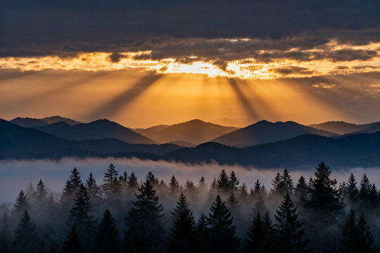 Sunlight rays breaking through clouds over mountain range with fog-covered forest at dawn