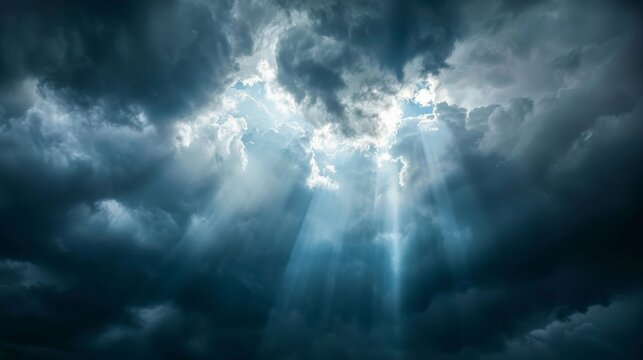 Sun rays breaking through dark storm clouds
