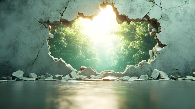 Sunlit jungle seen through a hole in a broken concrete wall.